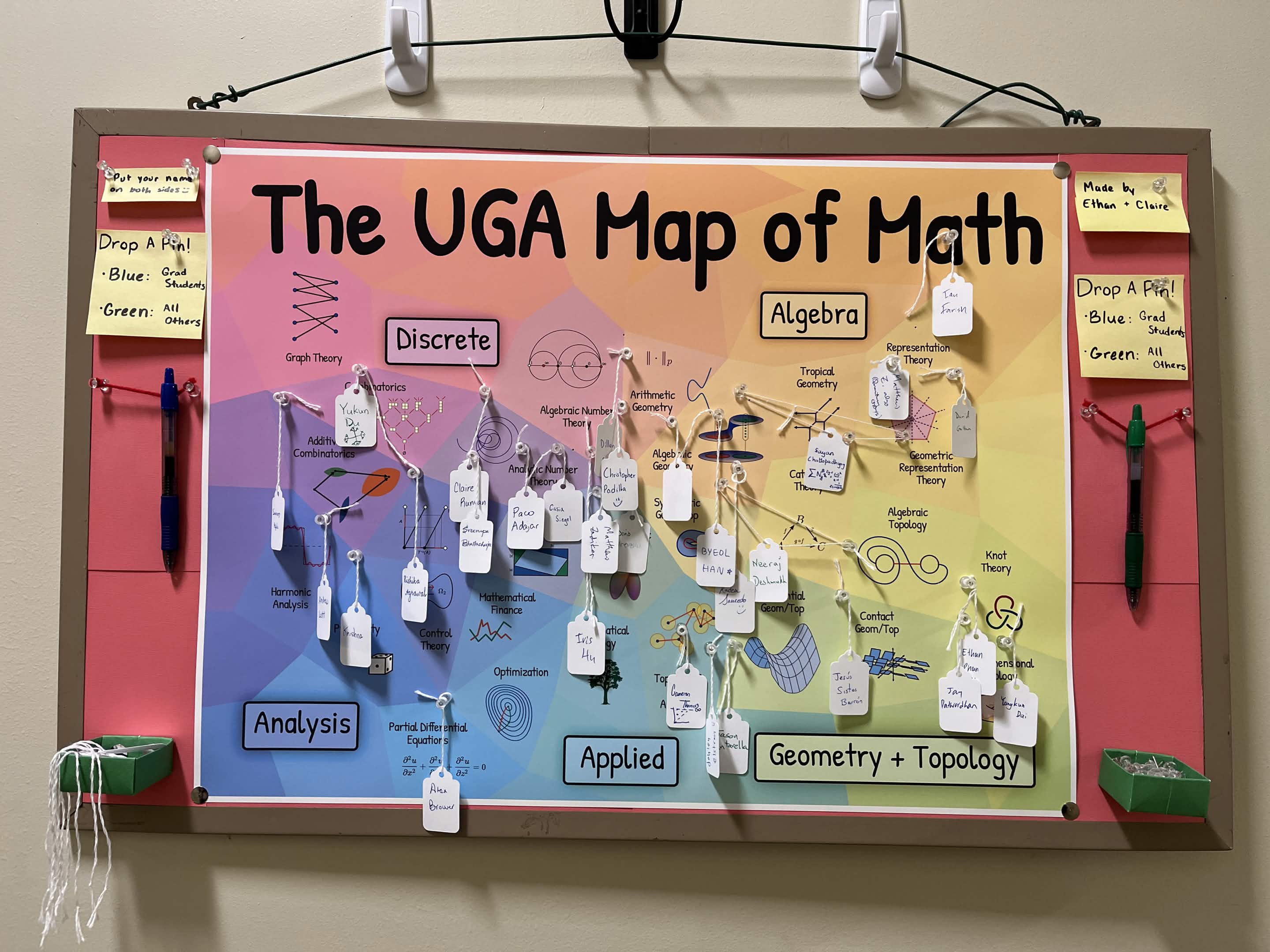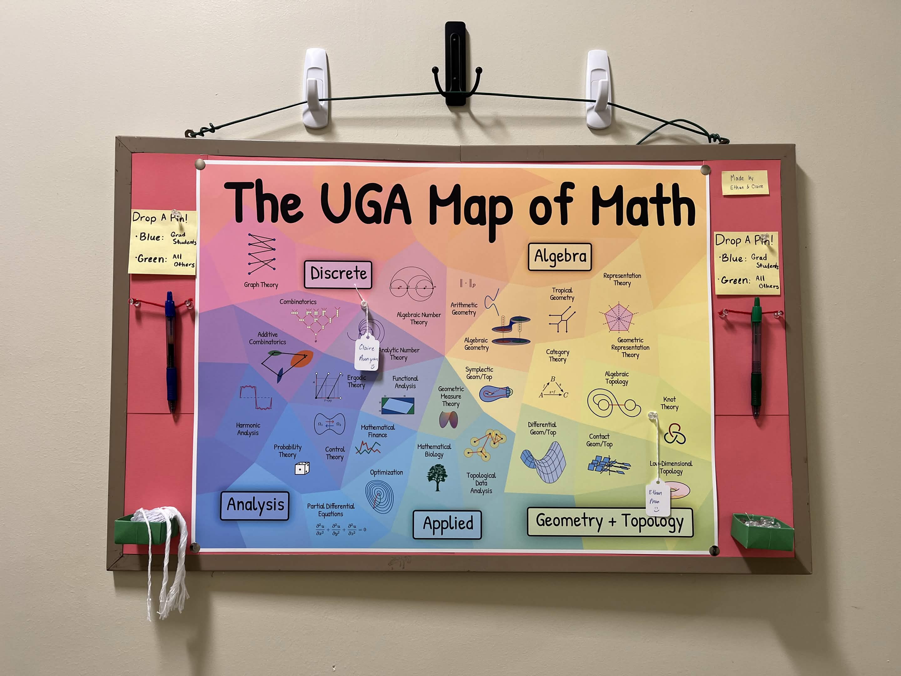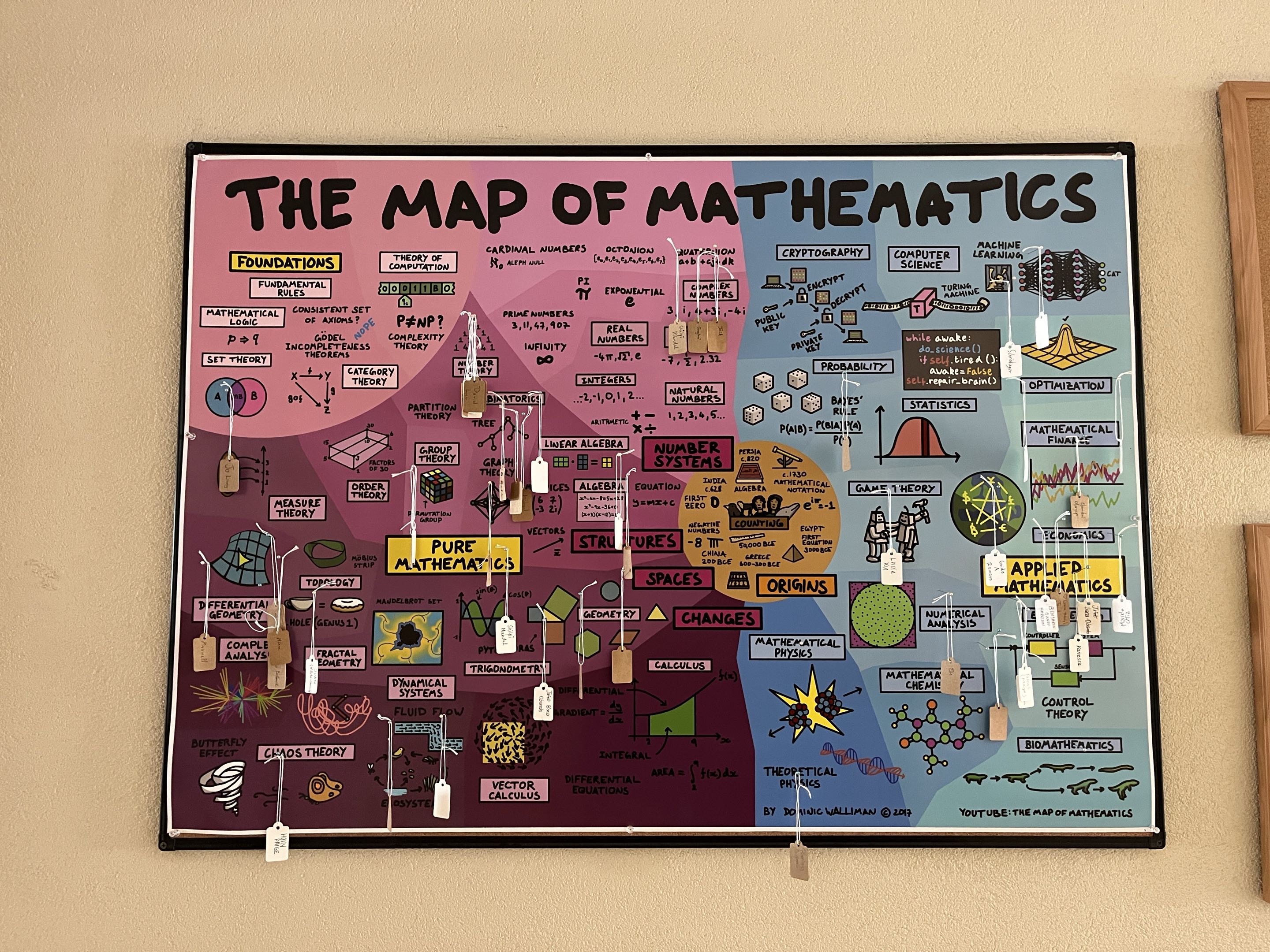 When I went on my 50-mile walk during the summer of 2025, I walked to Emory, specifically their math department. Inside, I saw that they had printed out The Map of Mathematics and had pins/tags for grad students and professors to "pin" what area of math they worked in. I was a huge fan of the concept, and this idea was kept in the back of my head.